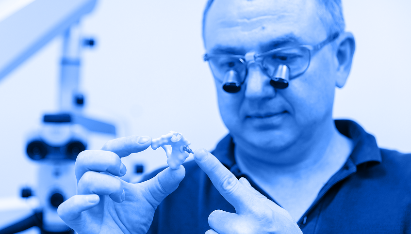 Практическая часть начинается с формирования задания 3D-принтеру на создание хирургического шаблона, представляющего собой каппу с отверстиями, соответствующими позициям имплантов. В отверстия вставляются металлические втулки, которые задают угол наклона и глубину установки имплантов.